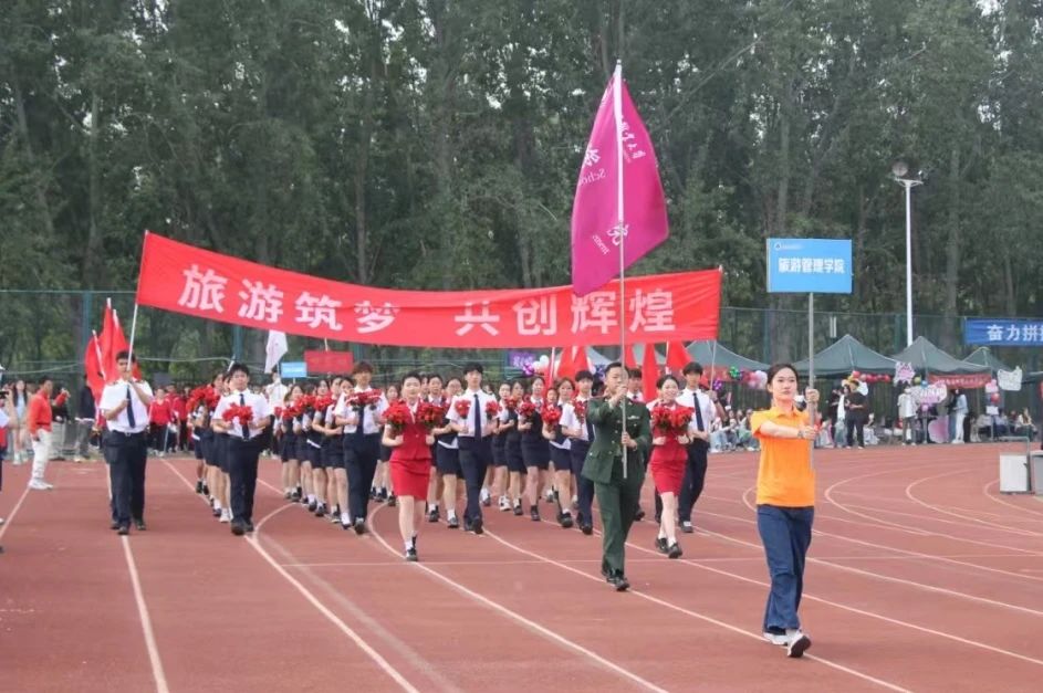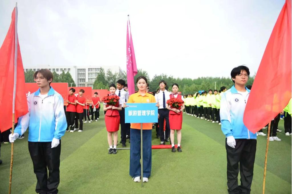 春风拂面,彩旗飘扬。旅游管理学院方阵步伐铿锵,身姿挺拔如白杨,眉眼间满是自信坚毅。"旅游筑梦,共创辉煌" 的口号声破空而出,响彻操场。他们昂扬的姿态、矫健的步伐,尽显旅游学子锐意进取的精神风貌,为运动会拉开精彩序幕。