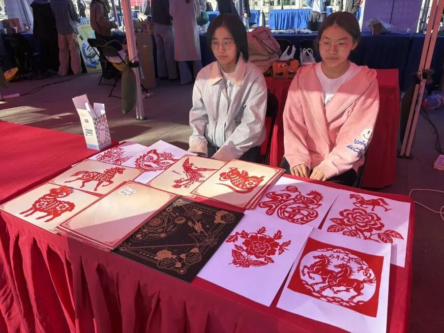 活动现场,金鳞翻飞的舞龙表演气势恢宏,灵动活泼的醒狮舞动引人驻足,传统民俗与春日美景交相辉映,营造出浓郁的文化氛围。在非遗文创展示区,“红之旅”实践团的剪纸作品成为焦点,作品涵盖栩栩如生的生肖瑞兽、寓意吉祥的牡丹纹样以及融汇时代气息的主题创作,线条细腻流畅,造型生动传神,实现了传统技艺与现代审美的有机融合,吸引了大量师生、市民驻足欣赏、拍照记录。