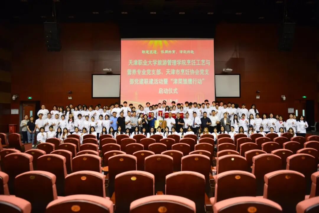 2025年5月28日,由天津职业大学旅游管理学院烹饪工艺与营养专业党支部与天津市烹饪协会党支部联合发起的党建联建活动暨“津菜雏鹰行动”启动仪式在海河园校区拉开帷幕。天津职业大学党委书记夏静波、天津市烹饪协会党支部书记、副会长兼秘书长孔令涛、学院相关领导、餐饮行业精英代表以及师生代表等200余人齐聚一堂,共同见证学院党建引领开启校企合作新篇章的重要时刻。