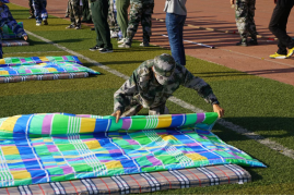 被整理过的被子棱角分明,结构紧凑,厚度、大小都恰到好处。铺平,捏角,压实,蓬松的军被眨眼间成了方方正正的“豆腐块”。一个个整齐的“豆腐块”是操场上最靓丽的风景,赢得了现场观众的阵阵掌声。